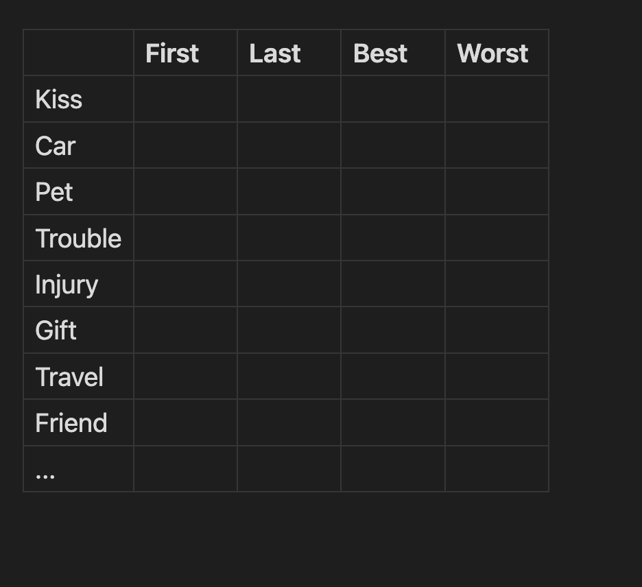The exercise is called “First Last Best Worst”. You write out a table, the column headers are “First”, “Last”, “Best” and “Worst” and as rows you add categories like kiss, car, book, etc.. Then you start with row one, for example who gave you your first kiss, your last kiss, the best kiss and the worst kiss and so on. It’s fun.